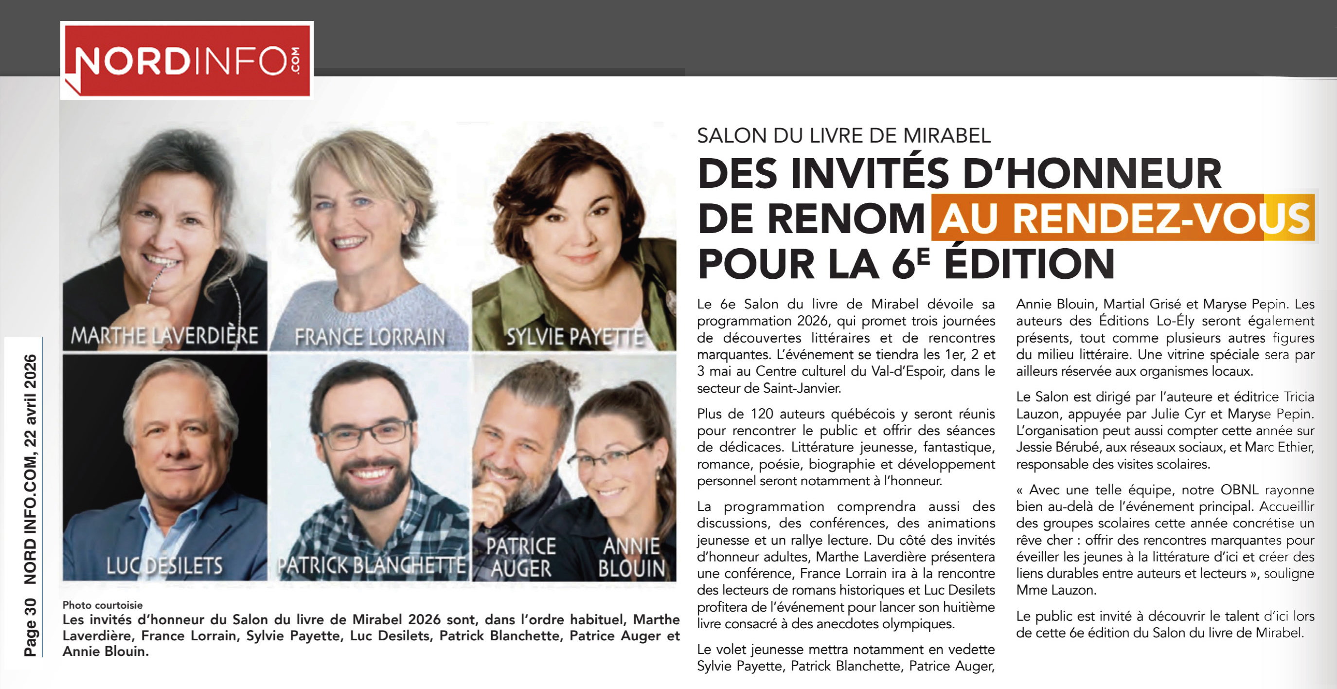 C’est avec une grande fierté que le 6e Salon du livre de Mirabel dévoile sa programmation 2026, riche en découvertes et en moments inoubliables. Cet événement rassembleur dédié à la littérature se tiendra les 1er, 2 et 3 mai prochains au Centre culturel du Val-d’Espoir, dans le secteur Saint-Janvier.